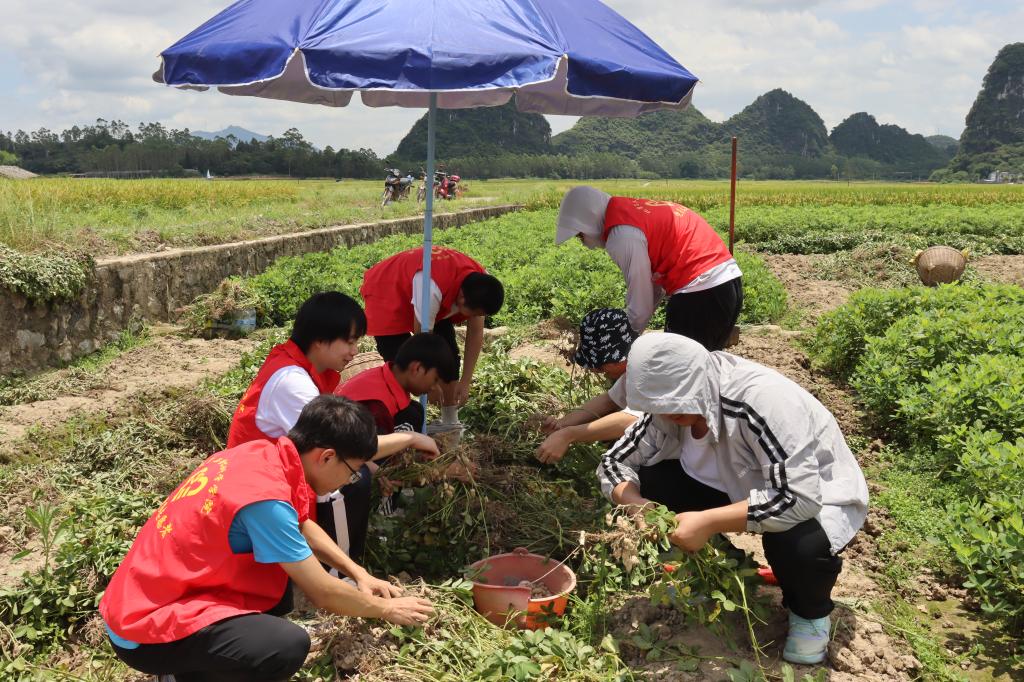 图为志愿者帮农户拔花生。
