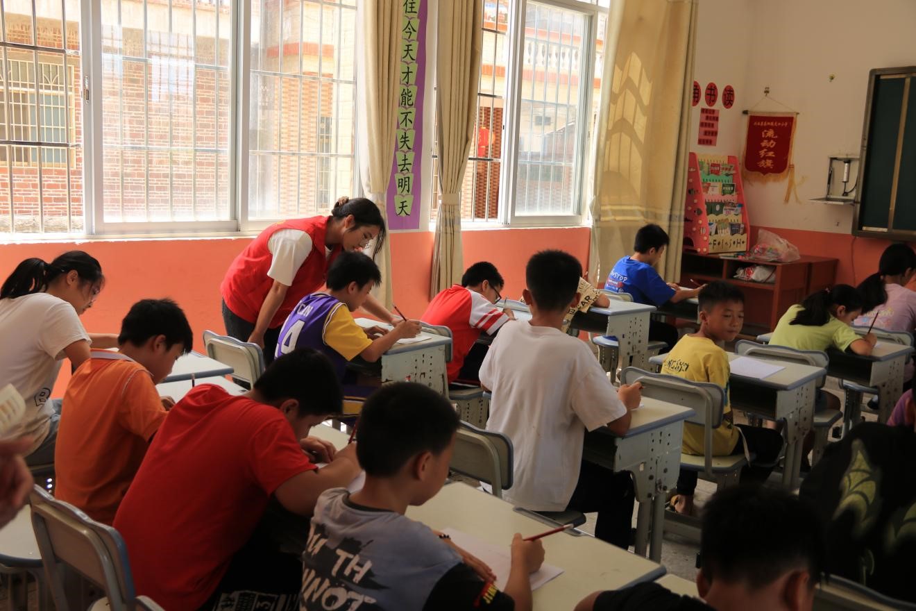 图为志愿者教同学们练习硬笔书法。
