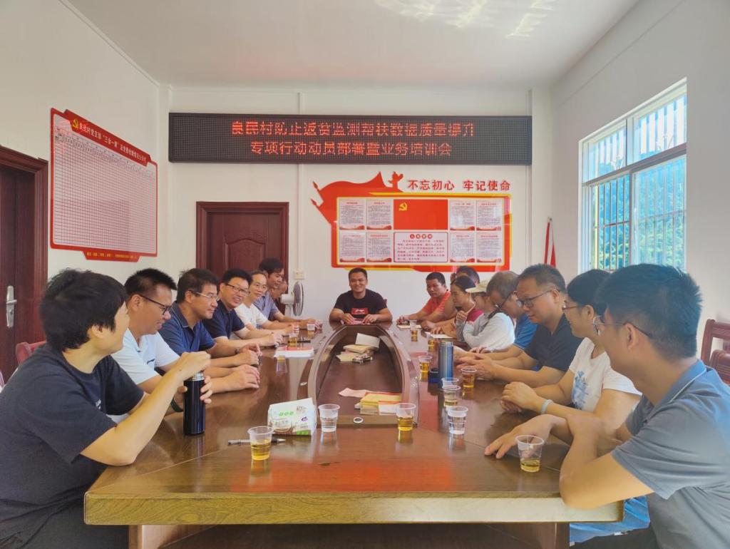 全体帮扶干部在良民村会议室召开防止返贫监测帮扶数据质量提升专项行动动员部署暨业务培训会,驻村第一书记覃驿翔向帮扶干部介绍上季度防止返贫监测帮扶的数据情况,并对本次帮扶工作的政策调整情况、入户回访要求、材料填写要求等做详细要求。