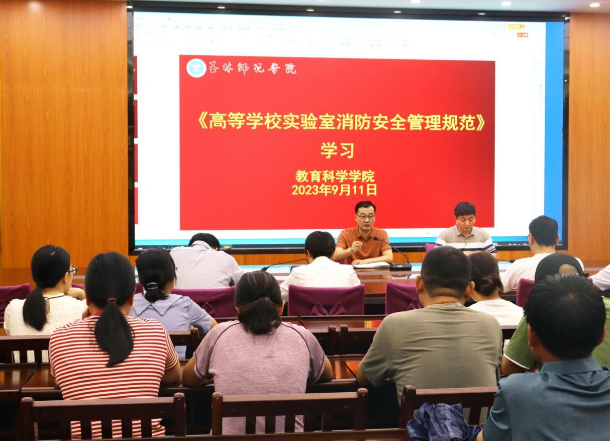 为加强消防安全及实验室安全工作的规范化管理,提高师生安全意识,9月11日上午,教育科学学院于我校东校区明德楼310会议室召开消防安全实验室安全教育专题会议。此次会议由该院党委书记崔海波主持,副院长程传利主讲,领导班子成员,全体教师参加此次会议。