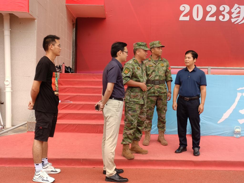 9月14日下午,政法学院党委书记梁修杰、院长周伟萌以及辅导员前往我校东校区新田径场亲切慰问参训教官和全体2023级军训新生。