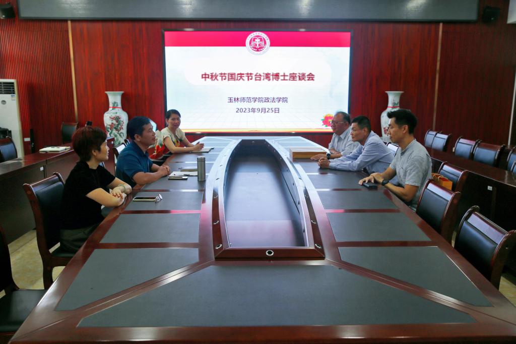 9月25日上午,政法学院于我校东校区明德楼508会议室召开中秋节国庆节台湾博士座谈会。该院党委书记梁修杰、党委副书记覃艳超,办公室主任参加座谈会,与台湾博士代表亲切座谈。