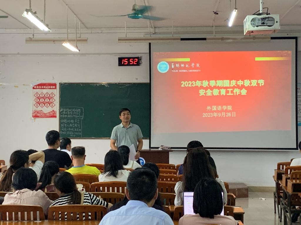 为确保学生假期安全教育工作,9月26日下午,外国语学院于我校东校区厚德楼1-301教室召开2023年秋季期国庆中秋双节安全教育工作会。会议由该院党委书记梁国初主持,全体教职员工参加。