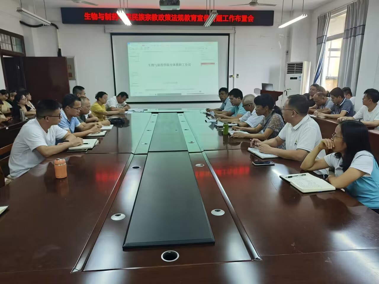 2023年9月26日,生物与制药学院在我校东校区格物楼BA405会议室召开民族宗教政策法规教育宣传专题工作布置会,会议由该院党委副书记兼副院长蒋德旗主持,全体教职工参加。