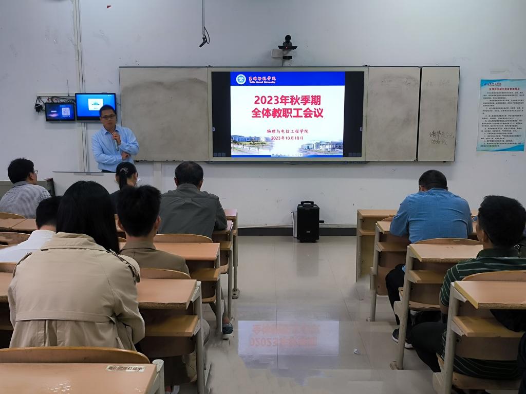10月10日下午,物理与电信工程学院于我校东校区文科楼105教室召开全体教职工会议,该院副院长巫钊、韦艳芳、罗志荣以及全体教职工参加会议。会议由巫钊主持。