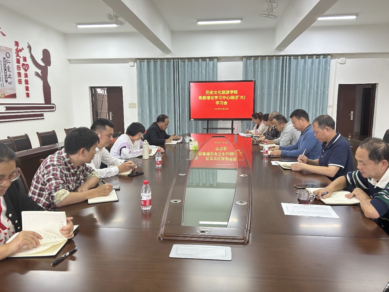 10月10日下午,历史文化旅游学院在我校东校区至善楼509会议室开展党委理论学习中心组(扩大)学习会,传达学习习近平总书记关于宣传思想文化工作的重要指示和全国宣传思想文化工作会议精神。学院党委书记曾凡贞主持会议,学院党委成员、师生党支部书记参加会议。
