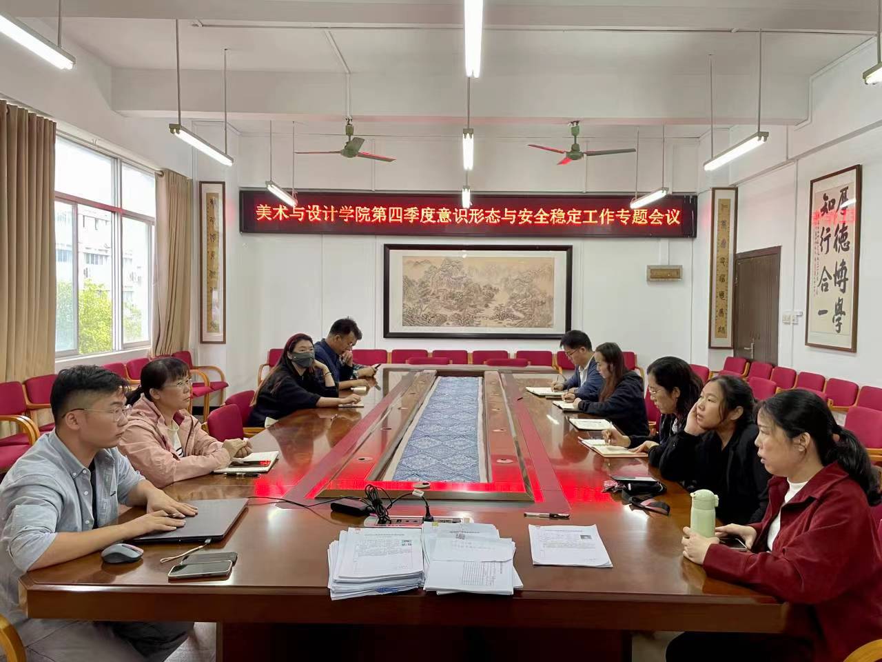 为推动意识形态和安全稳定工作有序开展,10月11日下午,美术与设计学院于我校东校区博学楼3-407会议室召开第四季度意识形态与安全稳定工作专题会议,该院党委副书记严耀燕,全体辅导员及各教研室主任参加会议,会议由严耀燕主持。