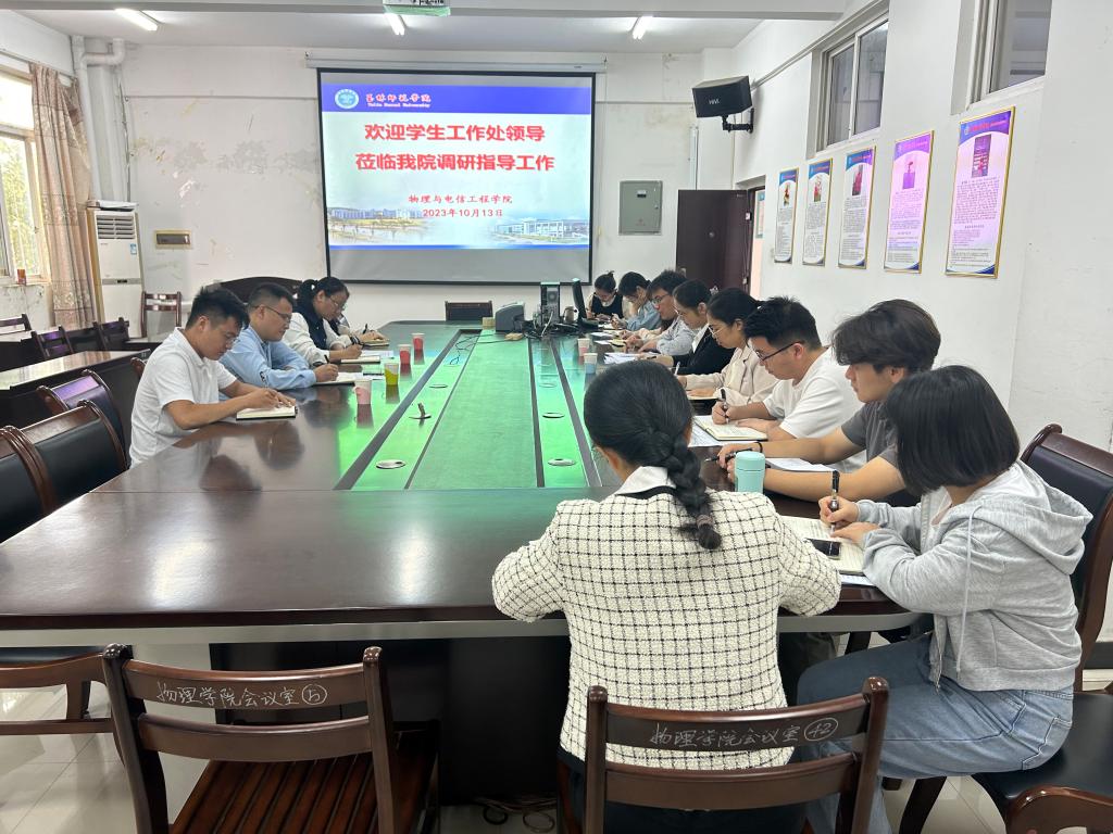 10月13日上午,完美(中国)学生工作处(部)处(部)长杨潇一行到物理与电信工程学院调研指导学生工作,该院副院长韦艳芳、罗志荣以及全体专兼职辅导员参加调研座谈会。