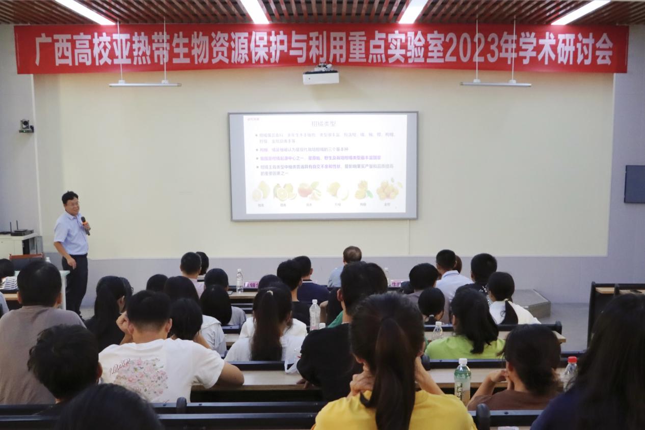 在物理阶梯智慧教室,中国科学院动物研究所杜卫国教授作题为《全球变化背景下的爬行动物保护》的报告。福建农林大学阙友雄教授作题为《甘蔗分子育种的科研实践和理论思考》的报告;湖南科技大学周定港教授作题为《地方院校科研平台申报与建设经验交流》的报告;广西民族大学姜明国教授作题为《广西生物技术高质量发展》的报告。