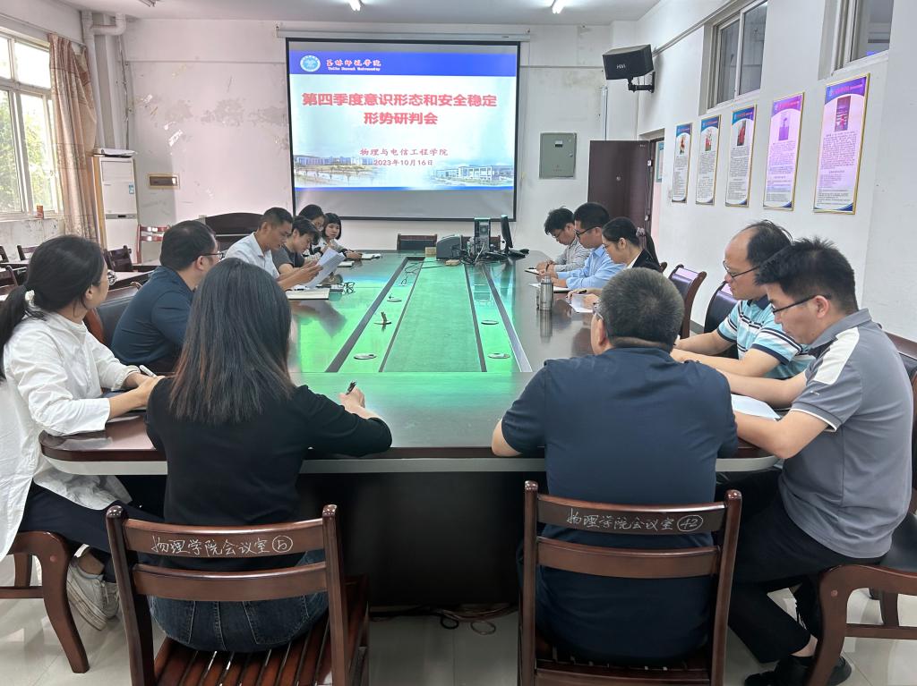 10月16日上午,物理与电信工程学院在我校东校区物电楼BG221会议室召开第四季度意识形态和安全稳定形势研判会。该院党政领导班子,院长助理,辅导员参加会议,会议由党委书记廉文武主持。