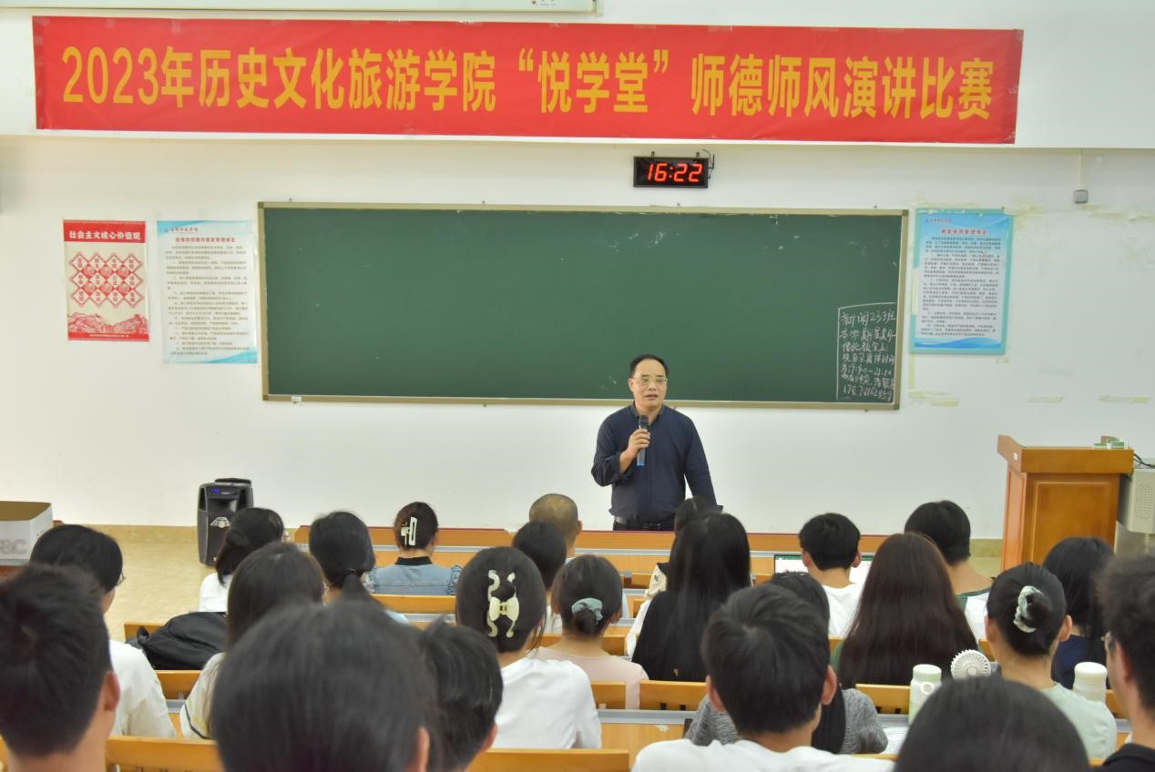 为展示师范生风采,进一步营造尊师重教的氛围,10月17日下午,以“躬耕教坛,强国有我”为主题的师德师风演讲比赛于我校东校区至善楼408教室举行。历史文化旅游学院党委书记曾凡贞、教师代表担任评委,比赛由该院学生代表主持进行。