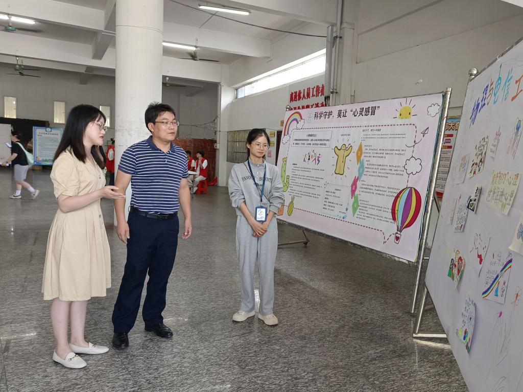 随后,罗志荣一行参观活动现场。在心理涂鸦绘画和阳光跳绳体验区中,学生借助五彩斑斓的画笔述说自己故事与情感,借助团队跳绳运动减轻压力,缓解负面情绪。在心理知识展板科普区中,通俗易懂的文字和精美的配图,吸引众多师生驻足学习心理知识。