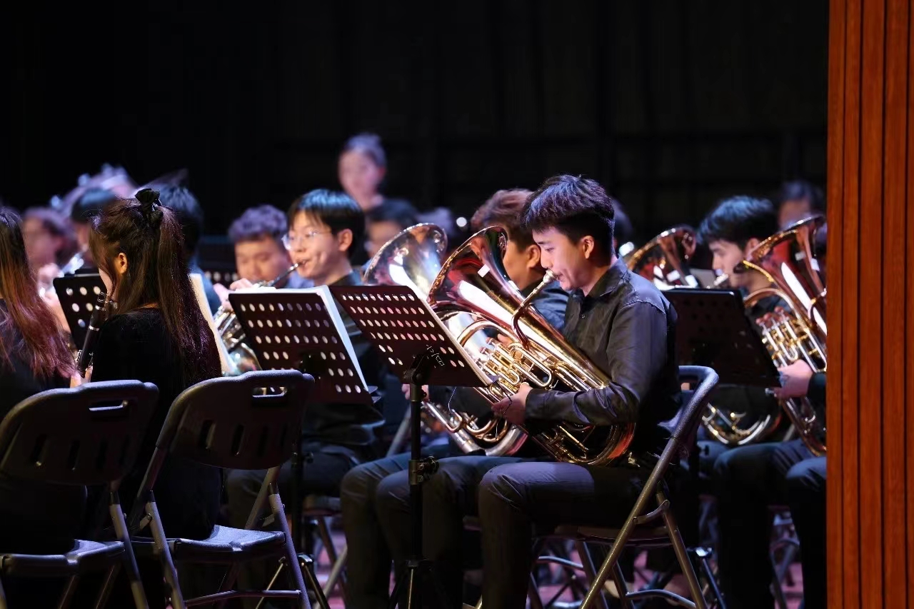 音乐会现场,音乐舞蹈学院的管乐团、合唱团与各兄弟院校的演奏员联袂献上一场管乐视听盛宴,有斗志昂扬、高亢嘹亮的红歌作品;还有旋律优美、悦耳动听的流行作品。《广西尼第呀》带领现场观众领略壮乡民族风情;《不忘初心》曲调悠扬,歌词暖心,一句“不忘初心,继续前进,万水千山,最美中国道路”道尽对祖国和人民的浓浓深情;《我的祖国》演奏出对祖国母亲深深的热爱与眷恋之情;《爱的协奏曲》以三种不同风格的旋律风格凸显“爱”之主题。师生们的精彩表演赢得现场的阵阵掌声。
