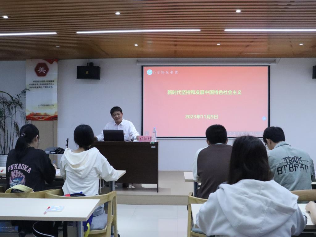 讲座上,程传利以“新时代坚持和发展中国特色社会主义”为主题,围绕“方向决定道路,道路决定命运”“中国特色社会主义进入新时代”“新时代坚持和发展中国特色社会主义要一以贯之”三方面展开详细论述,带领学生深入学习、领会习近平新时代中国特色社会主义思想的核心要义、精神实质、丰富内涵、实践要求,进一步引导学生深刻领悟“两个确立”的决定性意义,增强“四个意识”、坚定“四个自信”、做到“两个维护”。