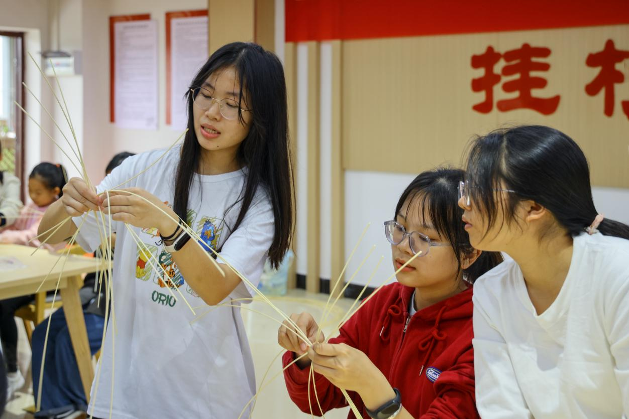 11月12日下午,班展源介绍了芒编技艺的基础知识和技能,随后带领同学们学习芒编技巧,让同学们切身感受到中国传统工艺芒编的独特魅力。动手实践环节,现场同学们了解大致方法后,在同学们的相互帮助下,很快就掌握了编织技巧,逐渐完成了自己手中精巧而独特的作品。