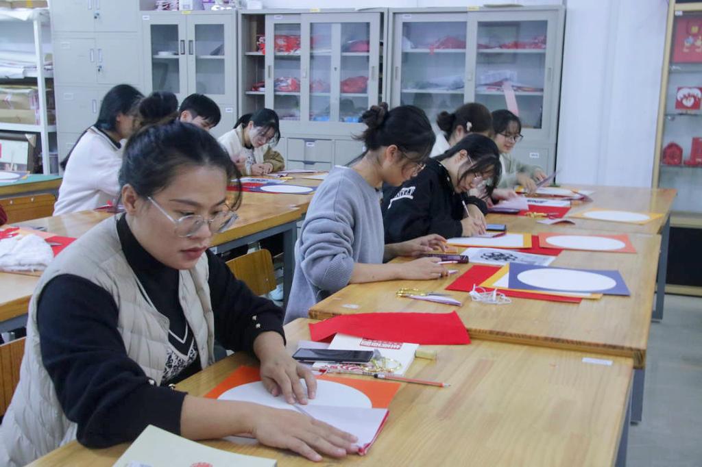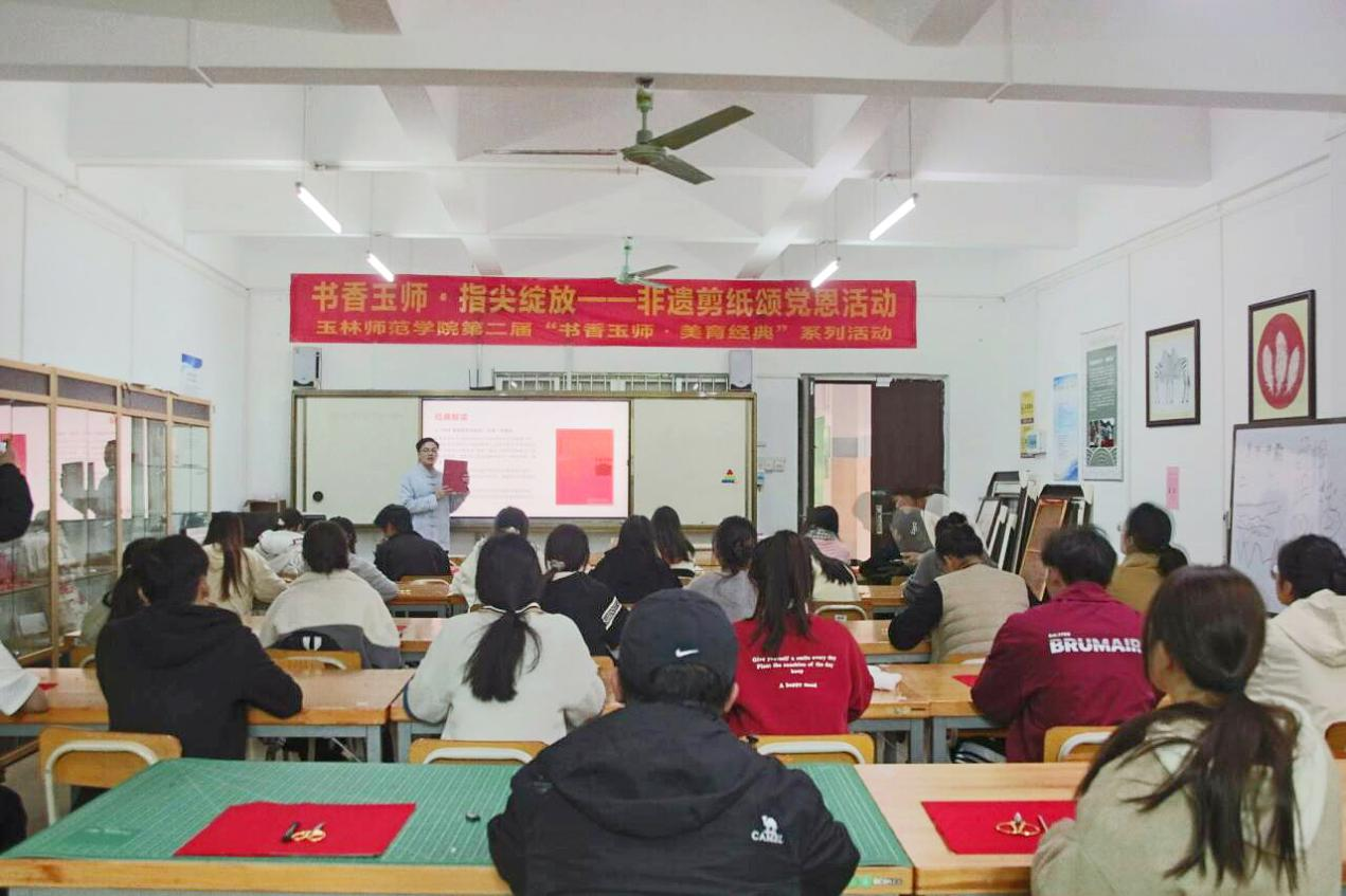 为深入学习贯彻习近平新时代中国特色社会主义思想和党的二十大精神,大力弘扬中华优秀传统文化与社会主义先进文化,进一步深化美育教育,提高人才培养质量,11月14日下午,由美术与设计学院承办的第二届“书香玉师.美育经典”系列活动之“书香玉师·指尖绽放”——非遗剪纸颂党恩活动于我校东校区综合实训中心204教室开展。该院党委书记黄培英,辅导员代表以及各二级学院学生代表参加活动,该院教师满瑜琳为学生们授课。