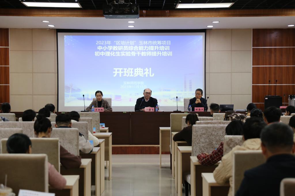 11月15日上午,2023年“区培计划”玉林市统筹项目——初中理化生实验骨干教师及中小学教研员综合能力提升培训开班典礼在我校青年教师论坛举行。我校副校长黄映然出席典礼并致词,玉林市教育局干部罗斯妮、全体培训学员及班主任参加。开班典礼由教师教育学院田海洋副院长主持。