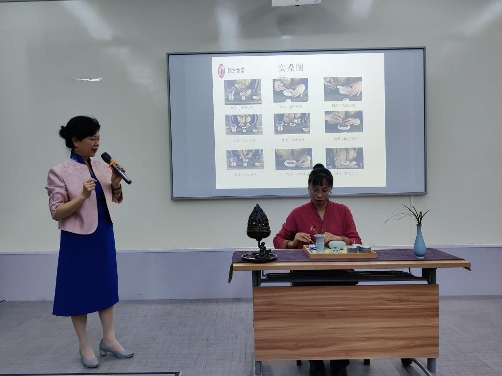 活动现场,师宝萍将她带来的各类香材分发给在场的师生进行闻香,让他们用心感受不同香材。随后,在场人员在教师的带领下,体验篆香、燃香、闻香。在闻香的同时,教师带领学生诵读黄庭坚的诗《香十德》,悠悠香气,郎朗书声,在场人员都沉浸其中。