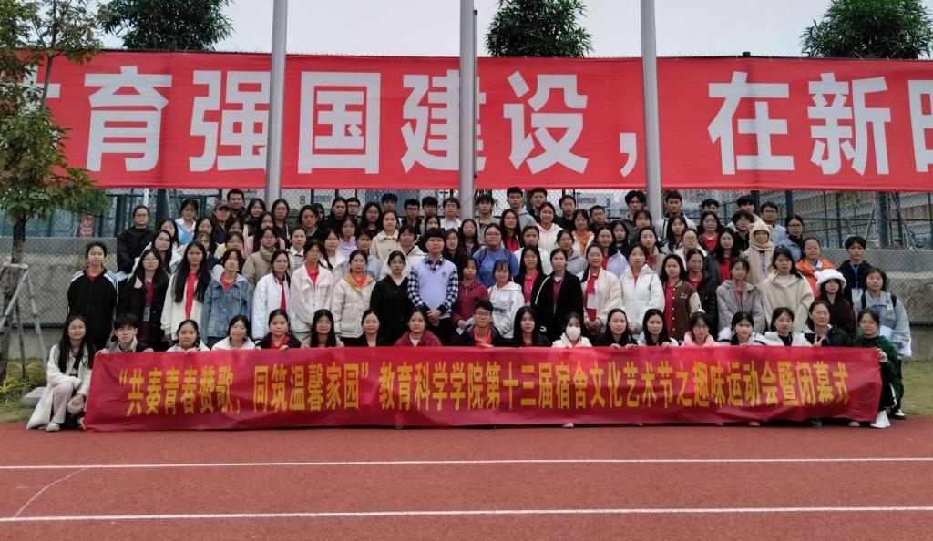 为丰富该院学生宿舍文化生活,增进学生间交流互动,12月3日上午,教育科学学院于我校东校区新田径场举办“共奏青春赞歌,同筑温馨家园”第十三届宿舍文化艺术节闭幕式暨趣味运动会。该院党委副书记李尚芳,团委书记,全体辅导员及各班宿舍代表到场参加。