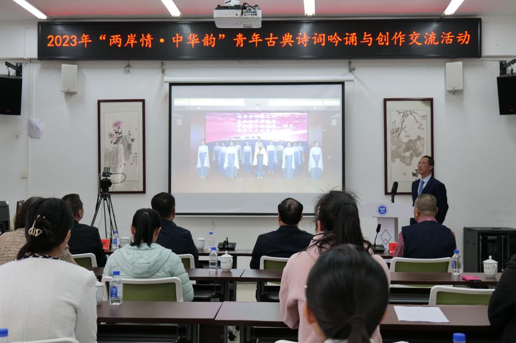 活动上,曹辛华教授通过视频致辞,他肯定了我校这些年在诗词创作与吟诵发展上所做的努力,希望我校能将此打造成品牌,创造更多机会,让两岸学生相约一地共同学习。台湾师范大学国文系教授文幸福表示,两岸联谊是一个开创性的活动。