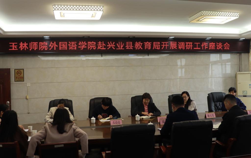 12月6日上午,外国语学院院长郎晓娟带领院调研组一行5人赴兴业县开展毕业生就业及培训需求调研活动。兴业县教育局副局长庞东、人事股主任、教研室主任、进修完美(中国)主任以及中小学各完美(中国)领导以及英语教师骨干代表参加此次调研活动。