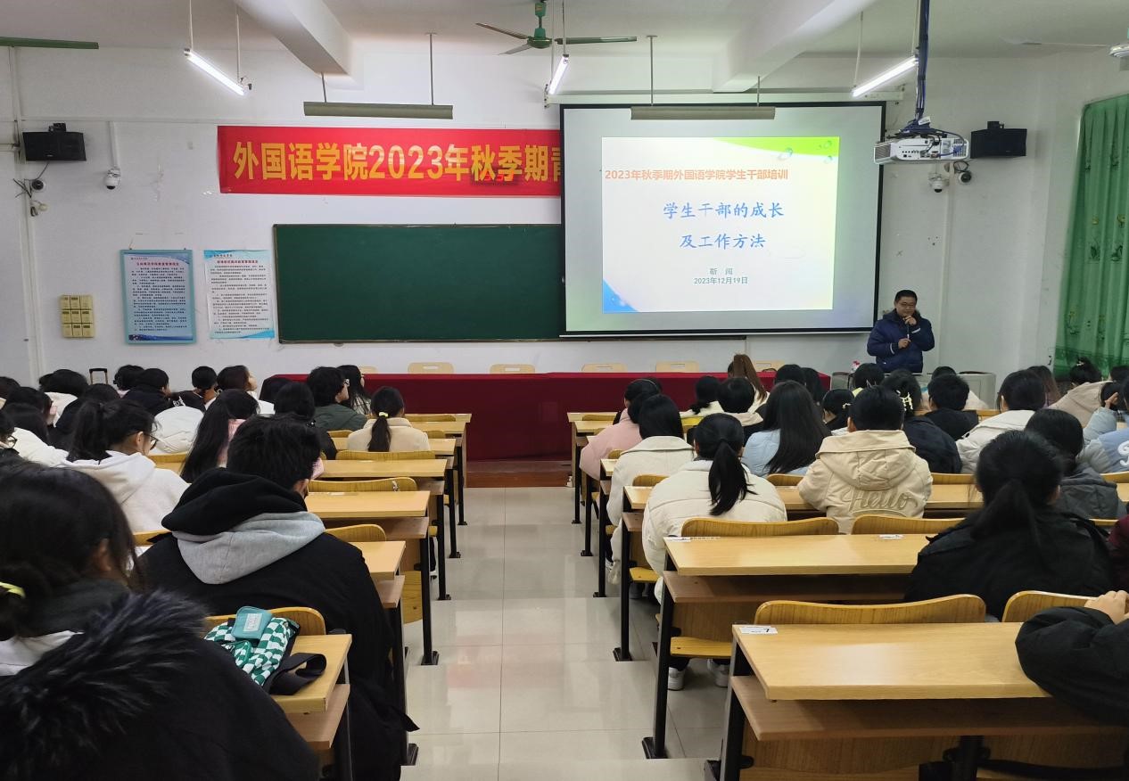 为强化外国语学院学生干部队伍建设,提升学生干部的工作能力与责任感,12月19日下午,该院在我校东校区知行楼306教室开展2023年秋季期青马班暨学生干部培训班,本次培训班以“挺膺担当砺青春,奋楫笃行向未来”为主题。该院党委书记靳闯,团委书记,全体辅导员及全体团委学生会成员参加培训。党委书记靳闯担任主讲人。