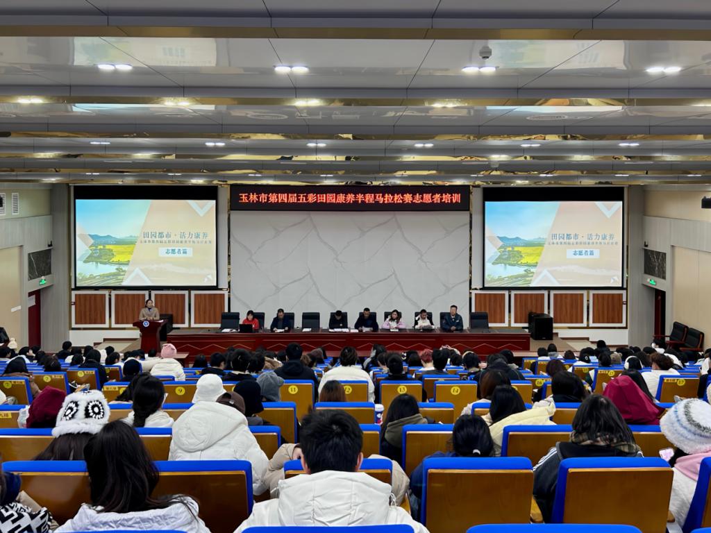 12月22日晚,玉林市第四届五彩田园康养半程马拉松赛志愿者培训会于我校东校区新民楼D101报告厅召开,美术与设计学院作为此次赛程的鸣谢单位共同参与培训会,该院党委书记黄培英、赛事总监林鹏、赛事现场总指挥卢宗允、健康广西行动形象大使周夏绿,该院赛事工作人员以及300多名青年志愿者参加培训会。