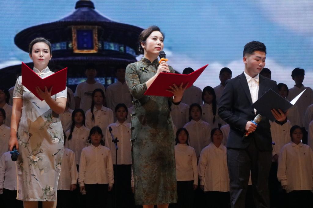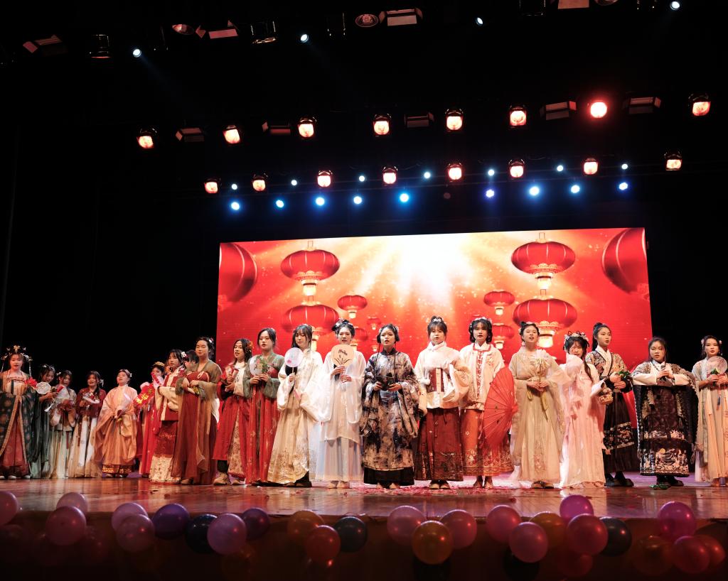第三篇章“笃行致远 熠熠辉煌”中,由美术与设计学院、物理与电信工程学院、计算机科学与工程学院和教育科学学院共同演绎的汉服表演《岁朝欢庆图》,以优雅的动作配上古典清新的音乐,充分展现出女子的娉婷、妩媚、丽人。最后,和着美妙的音乐及动人的旋律,辅导员代表朗诵《中国的微笑》以及美术232、美术233班的大合唱《有我》,为本场晚会划上圆满的句号。