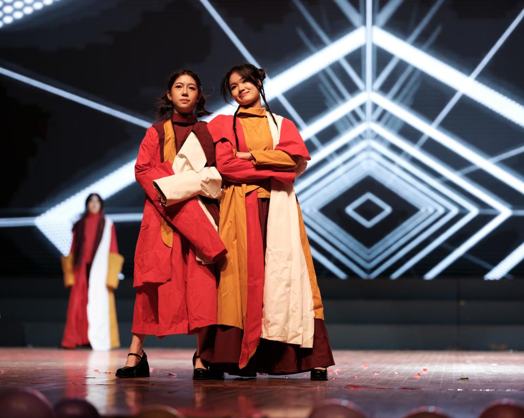 第一篇章“栉风沐雨 臻于至善”中,由退伍学生代表带来的《利刃出鞘》以虎虎生威的出拳,凌厉有力的踢腿,展现出忠诚的爱国心;来自环境设计222班的《瑶乡哩》以舞台剧形式将瑶族特色展现得淋漓尽致,赢得场上阵阵掌声。