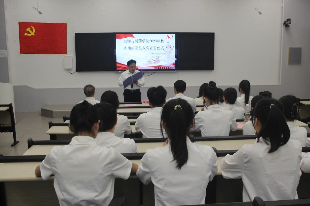 1月2日下午,生物与制药学院于我校东校区格物楼物理阶梯教室举行2023年秋季期新党员入党宣誓仪式。该院党委书记李国庆、专职组织员赖兴珲、生物科学系学生第二党支部书记以及2023年秋季期新党员参加此次仪式。