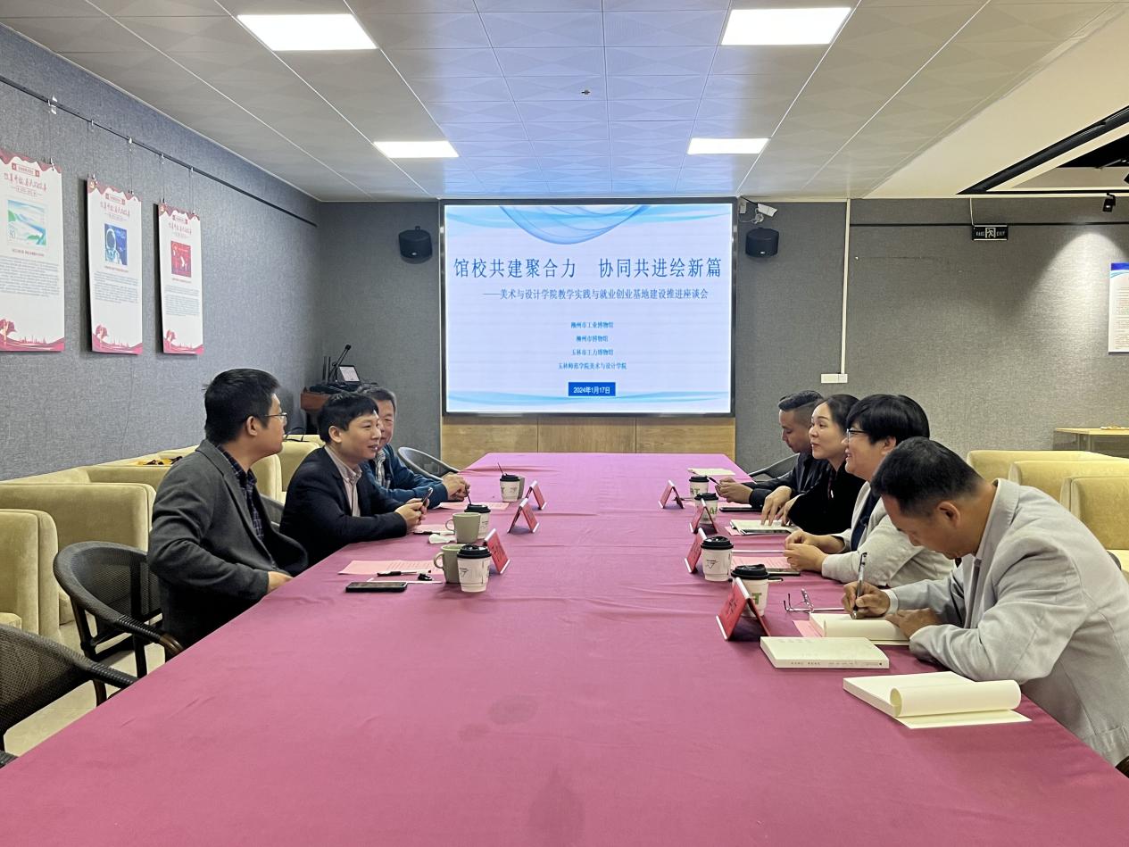 1月17日上午,美术与设计学院于我校东校区综合实训中心召开教学实践与就业创业基地建设推进座谈会。柳州工业博物馆馆长董劲林、柳州市博物馆副馆长于广生、玉林市王力博物馆馆长于少波以及该院领导班子成员参加座谈会,会议由党委书记黄培英主持。