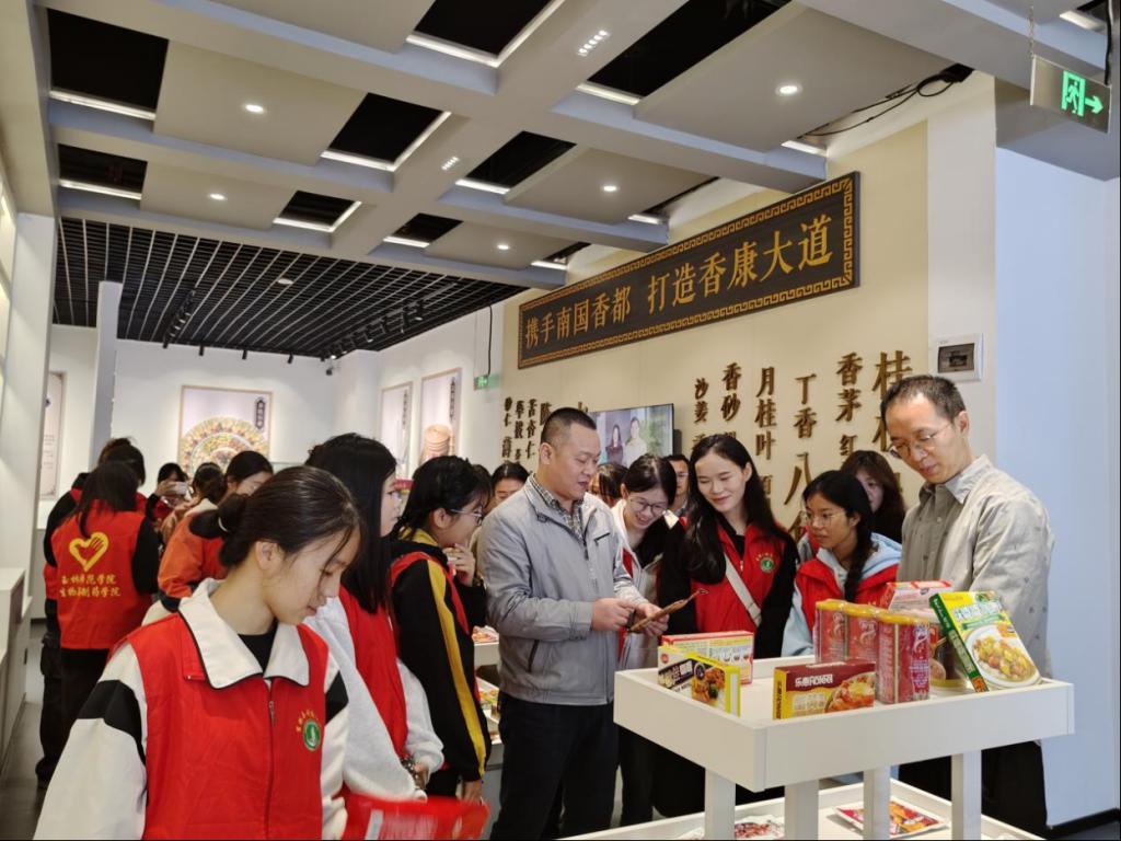 在玉林福达香料股份有限公司行政经理黄进的带领下,实践团实地参观了福达香料展厅、香料科普展览馆等地,详细了解该公司的发展历程、发展布局、香料产品特点、市场前景和人才需求。