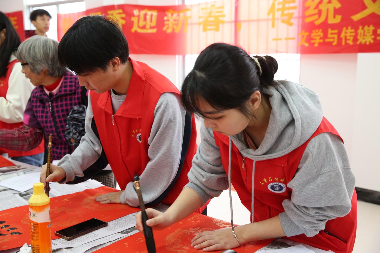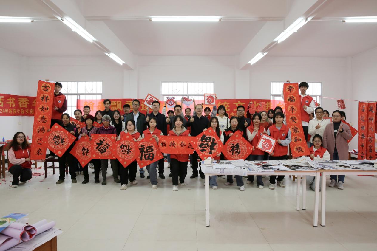 近日,文学与传媒学院国学实践团到兴业县小平山镇良民村开展“传承优秀传统文化,携手共建壮美乡村”社会实践活动,为村民义写春联送祝福。学院领导班子、全体辅导员和学生志愿者参加活动。