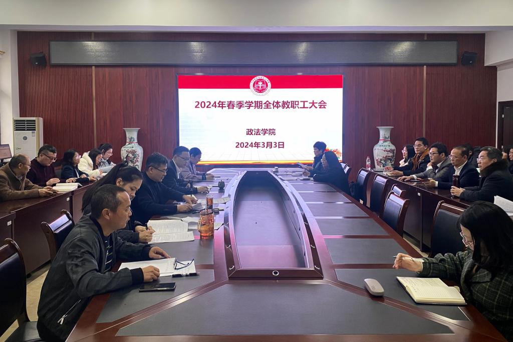 为确保新学期开学各项工作平稳有序进行,3月3日下午,政法学院于我校东校区明德楼508会议室召开2024年春季学期全体教职工会议。该院党委书记陈一栋、院长周伟萌、党委副书记黄燕纳、副院长姚靖、朱顺以及全体教职工参加本次会议。会议由周伟萌主持。