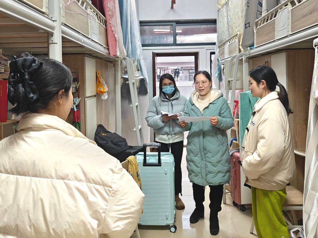 走访过程中,刘里琳与学生在宿舍亲切交谈,询问返校情况以及学习和生活等方面的问题,深入了解学生的假期状况,同时对宿舍安全和卫生情况进行检查,嘱咐学生注意用电安全,杜绝使用违规电器,严防火灾问题,并强调最近天气潮湿,不要把排插拉到床上,以免发生意外。此外,她还提醒返校学生要增强反诈意识,保护好个人财产,嘱咐学生要勤打扫,多通风,打造整洁的宿舍环境,维护好宿舍安全。
