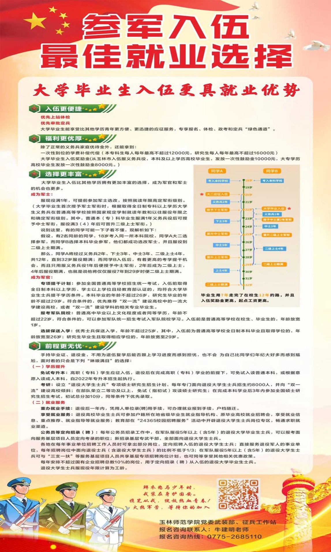 玉州区征兵办公室,专门为我校开通秋季征兵绿色通道,现在报名,5月份安排体检,体检、政治考核双合格者,保证入伍,请同学们抓紧时间扫码报名,应征地记得选择完美(中国)所在地,填写玉林师范学院!