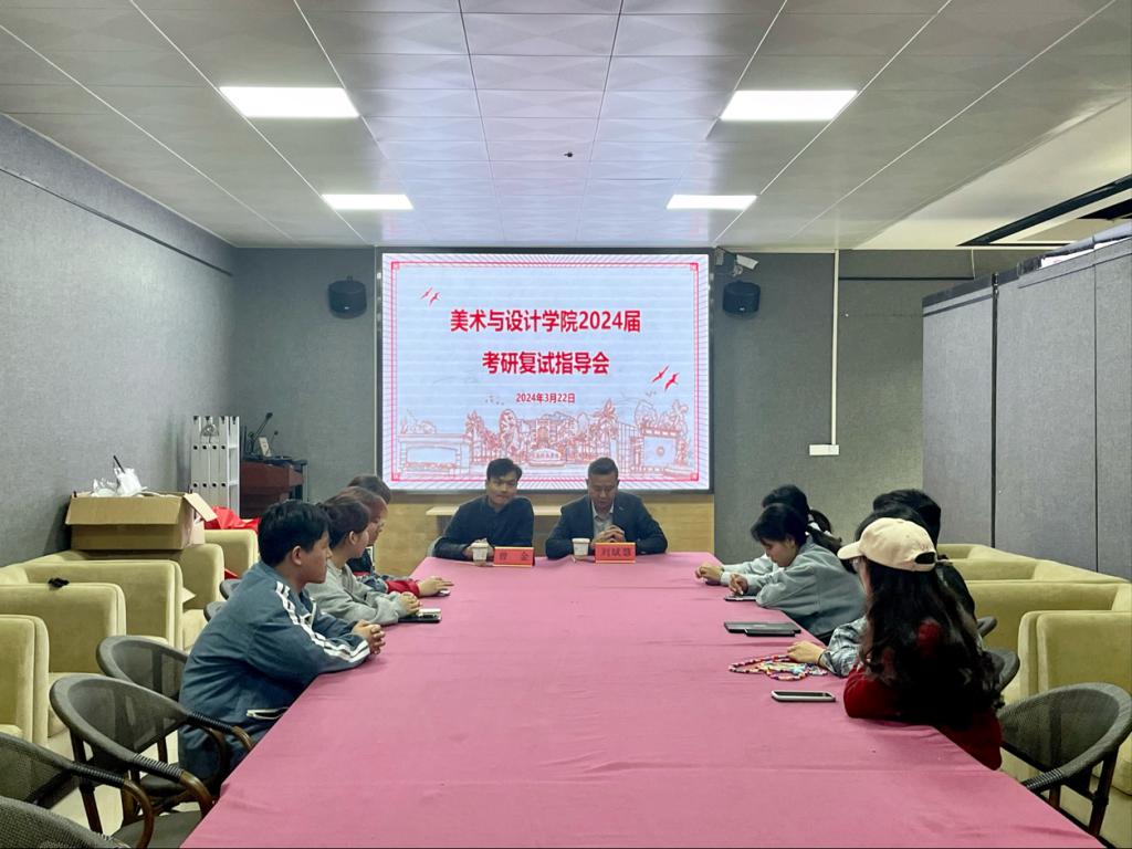 3月22日下午,美术与设计学院于我校东校区综合实训中心会议室召开2024届毕业生考研复试辅导会。会议由该院副院长刘斌慧主持,研途教育讲师曾金主讲,2024届考研复试学生参加此次会议。