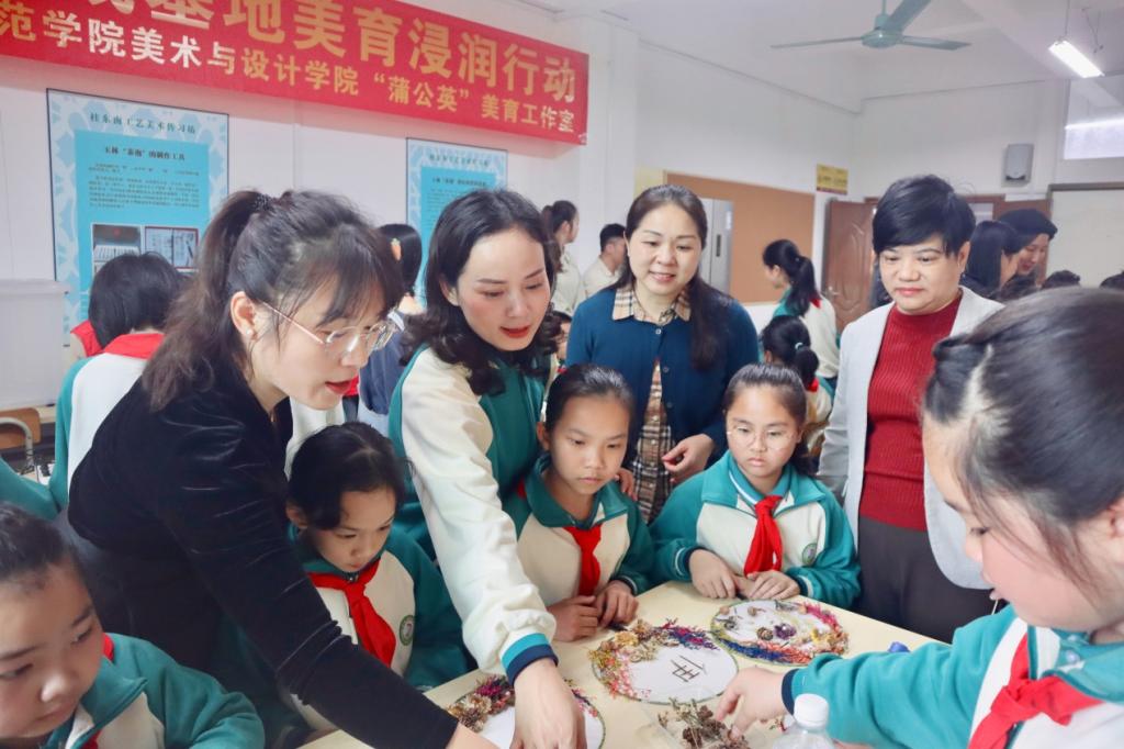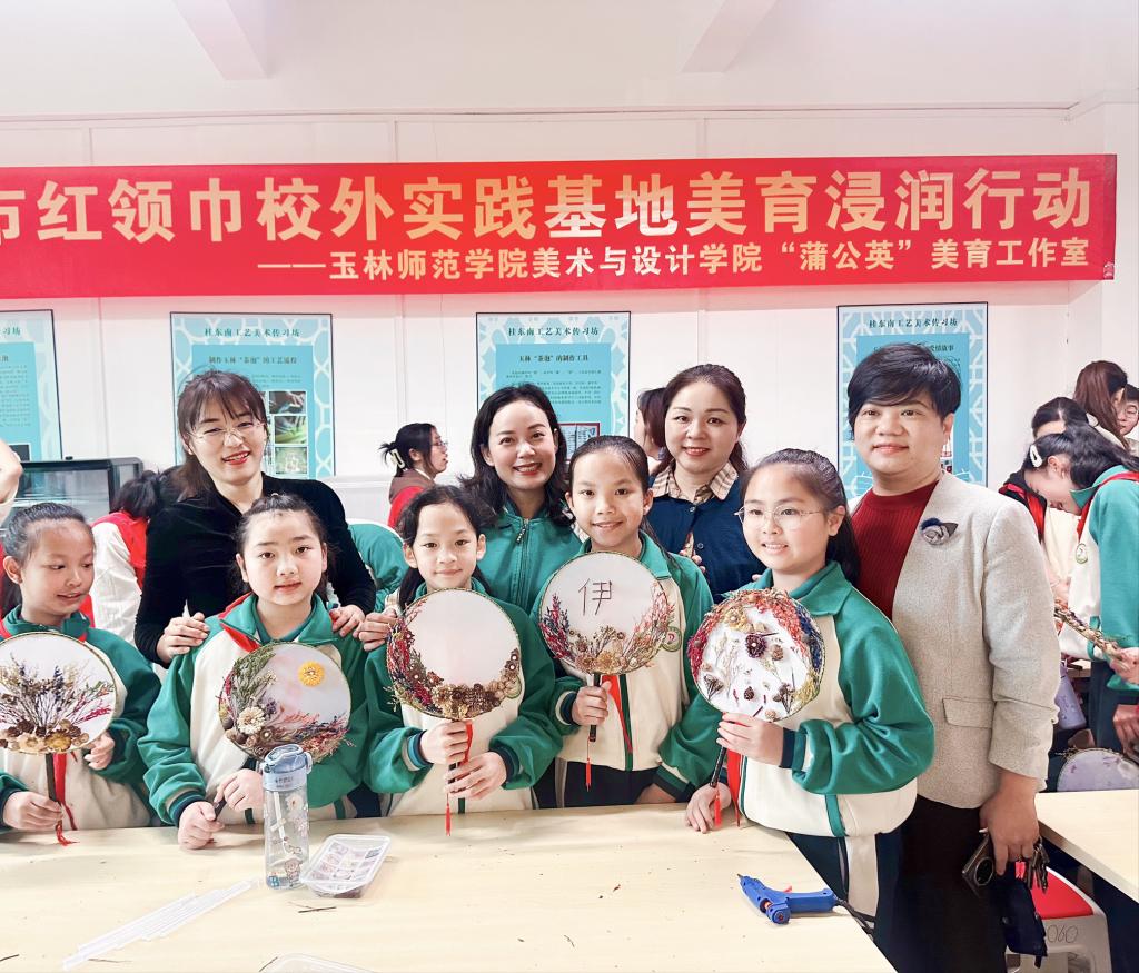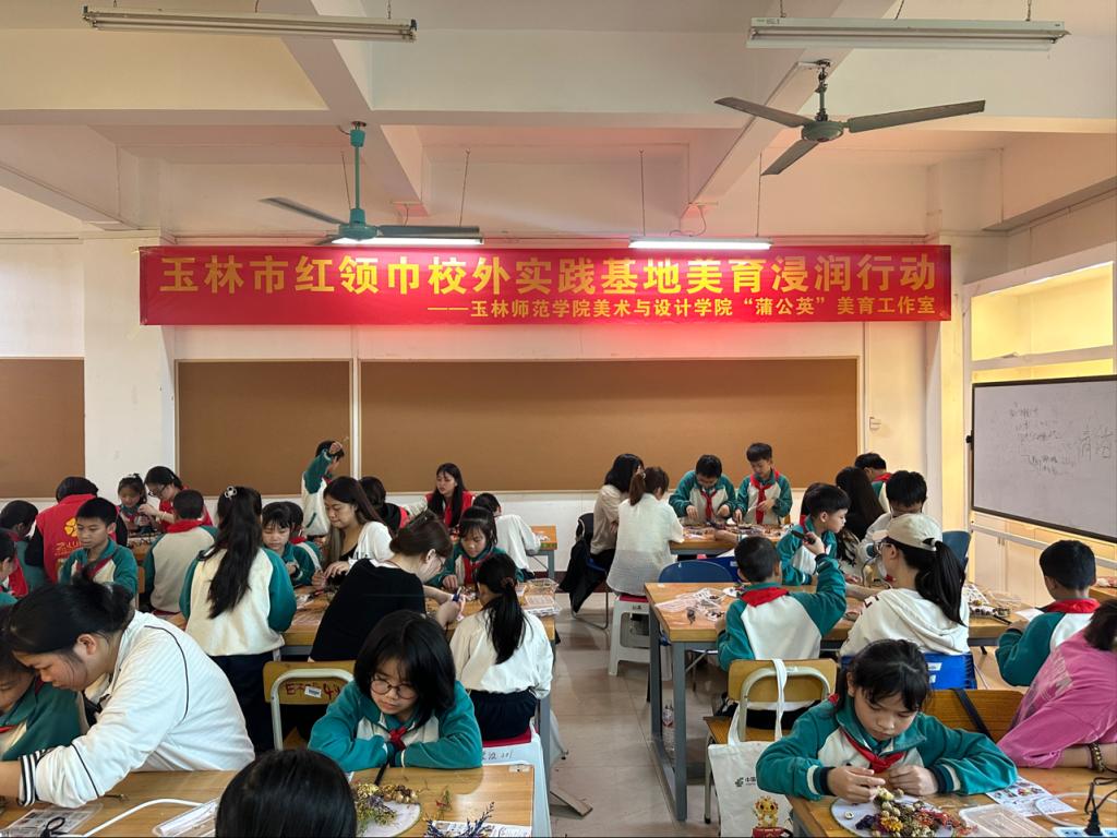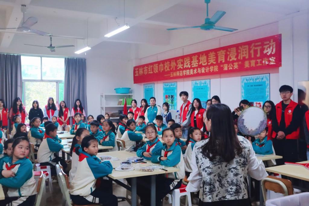 为推进少先队员美育教育的全面发展,提高少先队员的艺术修养和审美能力。3月23日上午,美术与设计学院“蒲公英”美育工作室于我校东校区开展玉林市红领巾校外实践基地美育浸润行动大芦小学专场活动。该院党委书记黄培英等领导班子成员、辅导员及教师代表,团市委兼职副书记、玉林市玉州区大芦小完美(中国)长邱春兰及师生代表100余人参加此次活动。