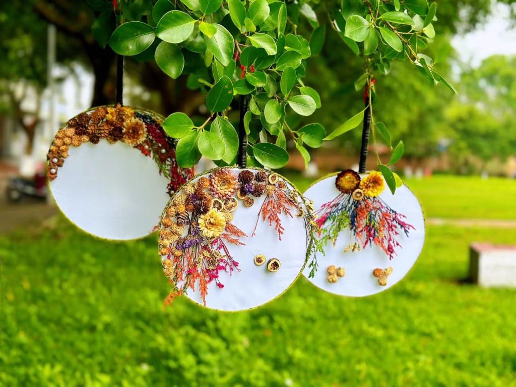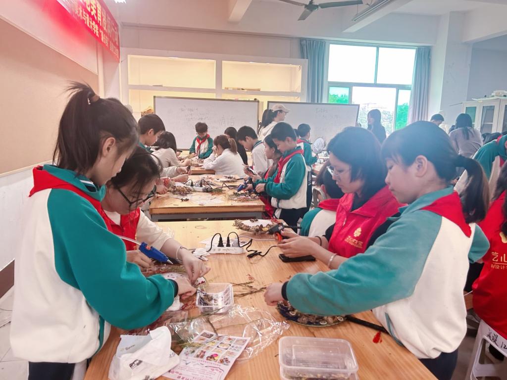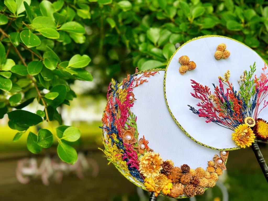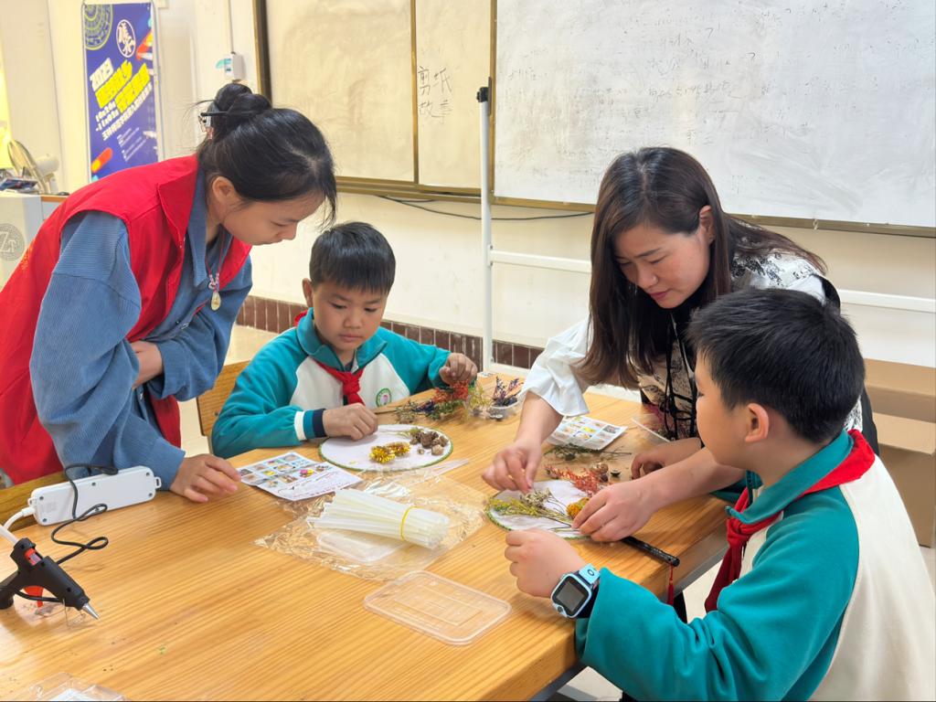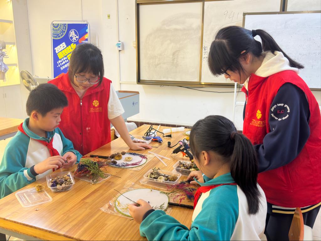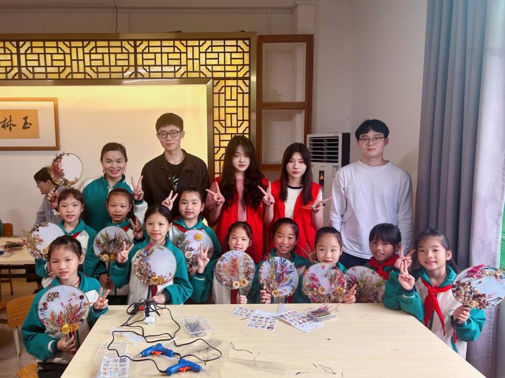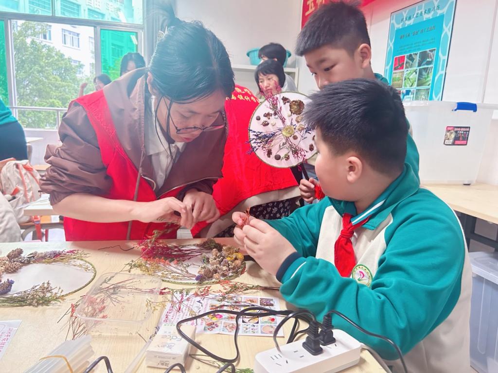 活动中,教师和大学生志愿者向少先队员详细介绍团扇的材质、形状、用途、特点、寓意以及制作方法,鼓励少先队员们发挥奇思妙想,用一花、一叶、一妙手创作出兼具观赏性和实用性的团扇。少先队员们自由发挥,在教师和大学生志愿者的帮助下,将干花进行裁剪、搭配色彩、摆放、粘贴。在欢声笑语中,一把把平淡无奇的素面扇面变得缤纷多彩。