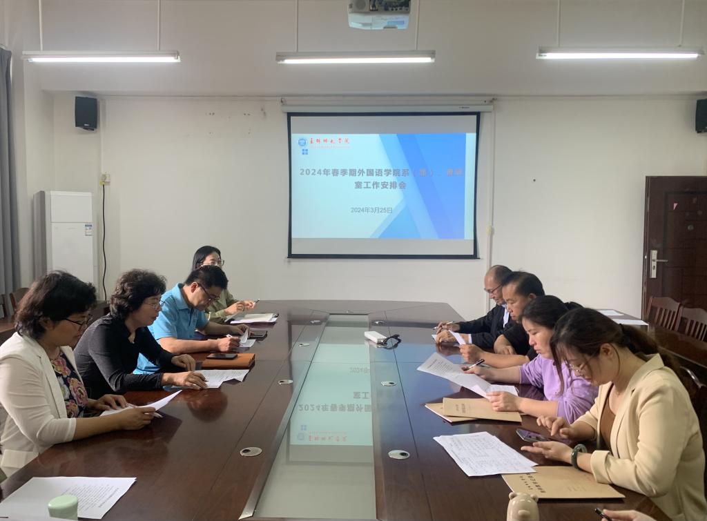 3月25日下午,外国语学院在我校东校区厚德楼1-306会议室召开2024年春季期系(部)、教研室工作安排会。会议由副院长耿玉芳主持,该院党委书记靳闯,院长郎晓娟,教学秘书以及各系(部)、教研室主任参加会议。