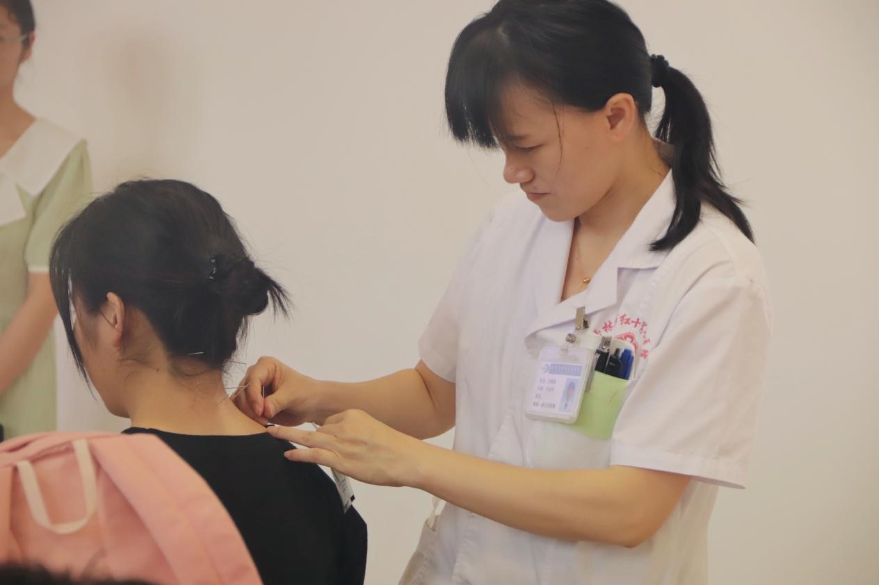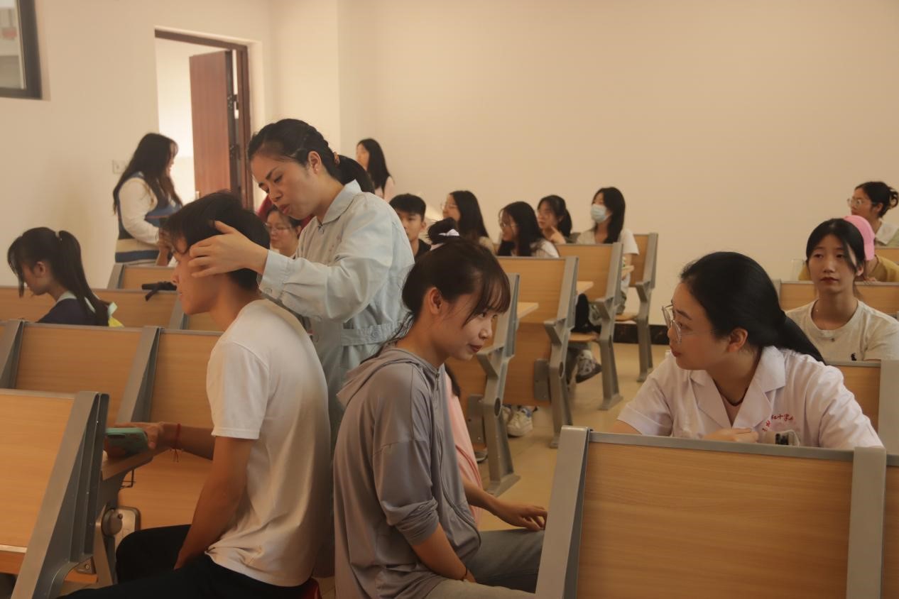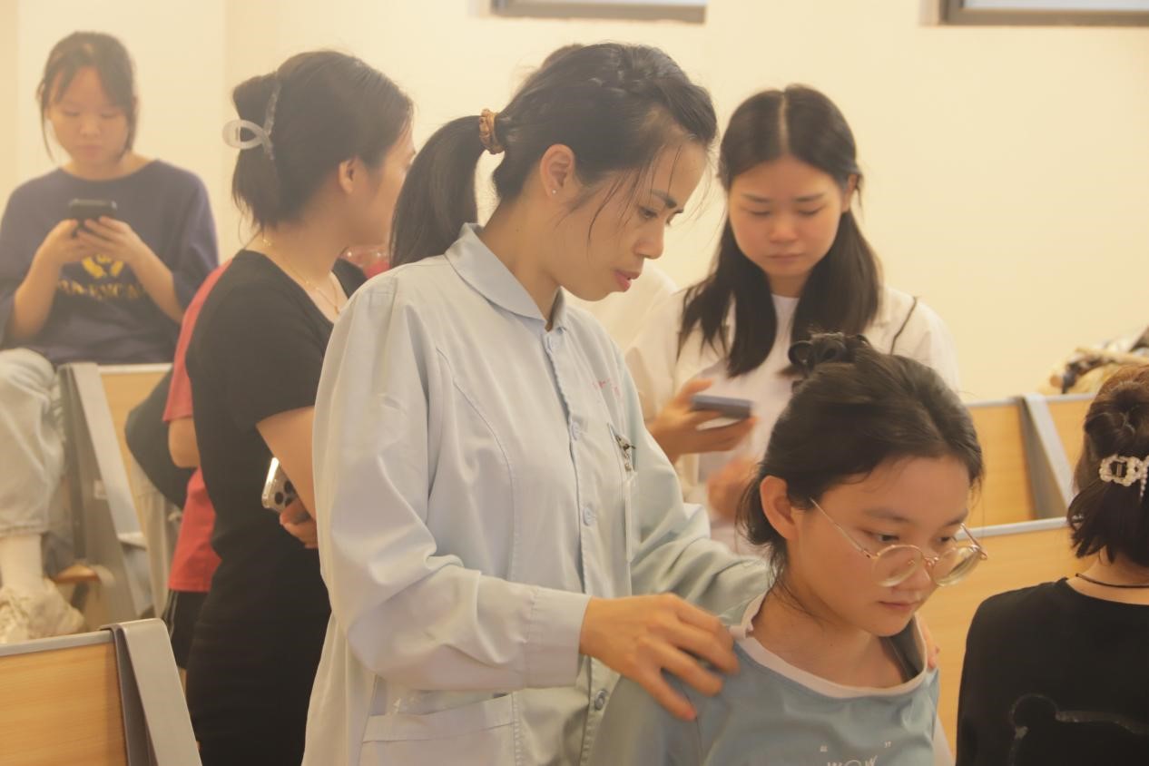 义诊期间,李耀新简要介绍中医科基本情况,并就中医独特的诊疗方式进行详细的阐述。随后,李耀新及其团队成员提供个性化的诊疗服务,在场学生纷纷排队等候咨询和诊治。本次义诊项目涵盖脉诊、推拿按摩、针灸理疗、头部治疗等多种中医疗法。针对学生颈椎病、睡眠障碍、腰部疼痛、肠胃不适、宫寒等常见健康问题,李耀新团队提供专业的医疗方案,其中包括火龙灸、药酒姜疗法等特色治疗方法,以及相应的中药调理建议。