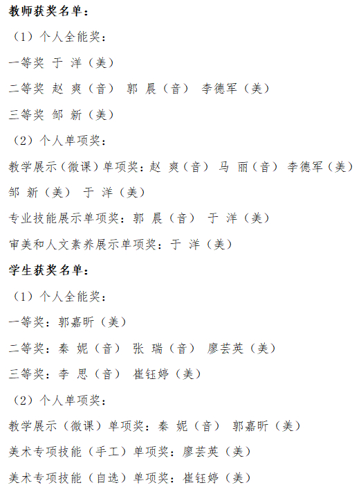 我校高度重视本次比赛,为此,音乐舞蹈学院、美术与设计学院赛前积极做好师生选手选拔和参赛准备工作,终获得喜人成绩。此次比赛取得的佳绩,进一步集中展示了近年来我校音乐教育、美术教育教学改革的特色、创新、进步与成效,也是对我校音乐教育专业、美术学专业教学质量的一次展示。我校将本次展示作为契机,积极推进新时代高校音乐教育、美术学专业课程与教学改革,抓好美育教师源头培养,努力培养素质全面、一专多能、适应基础教育改革发展需要的高素质专业化创新型教师队伍和艺术教育专业人才。