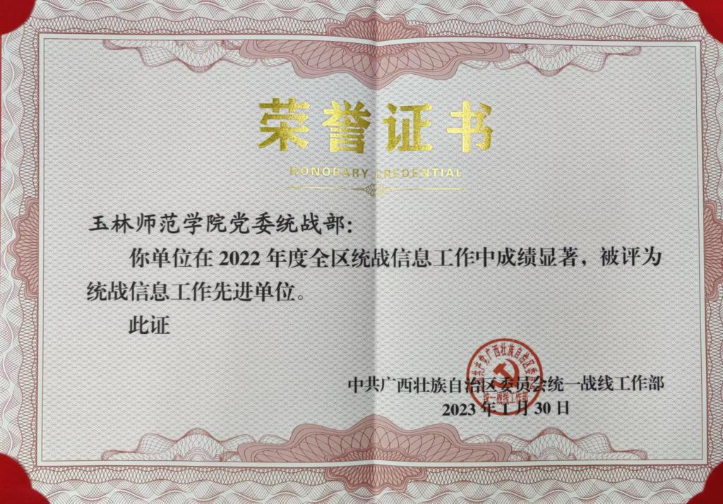 近日,全区统战部长会议在南宁召开。大会深入贯彻落实党的二十大精神和全国统战部长会议精神,总结2022年工作,部署2023年任务,并为获得全国、全区统战信息工作和统战理论政策研究、统战工作实践创新成果奖项的先进单位(个人)颁发荣誉证书。我校获评为2022年度全区统战信息工作先进单位,这也是我校连续2年获得此项荣誉。