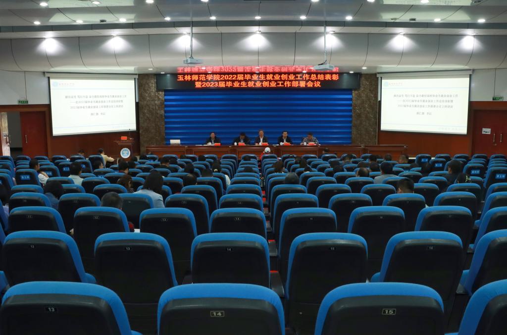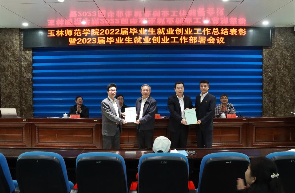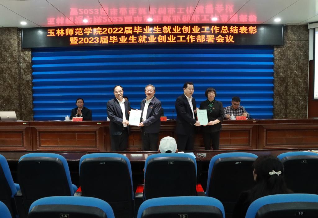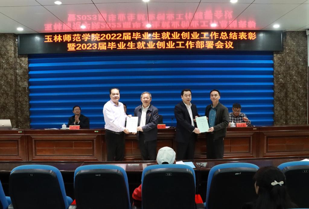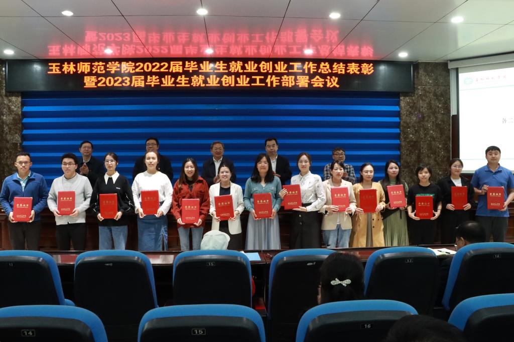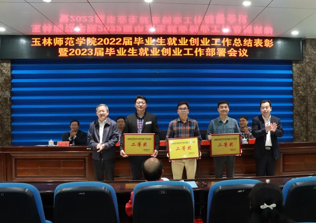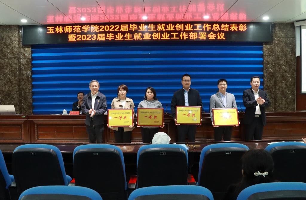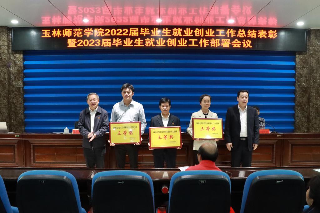 会上,韦广雄宣读《关于表彰玉林师范学院2022年毕业生就业工作先进集体和先进个人的决定》文件,宣布教育科学学院、生物与制药学院、数学与统计学院、体育健康学院等4个单位被评为“玉林师范学院2022年毕业生就业工作先进集体一等奖”,计算机科学与工程学院、外国语学院、化学与食品科学学院等3个单位被评为“玉林师范学院2022年毕业生就业工作先进集体二等奖”,文学与传媒学院、政法学院、物理与电信工程学院等3个单位被评为“玉林师范学院2022年毕业生就业工作先进集体三等奖”。夏恩强等66人被授予“玉林师范学院2022年毕业生就业工作先进个人”荣誉称号。