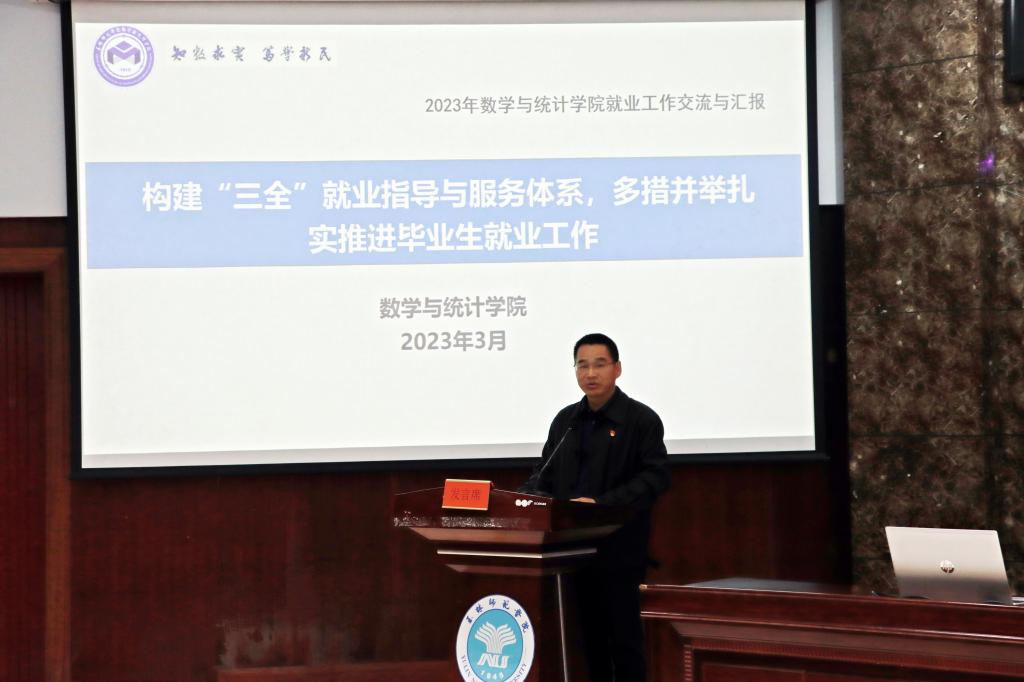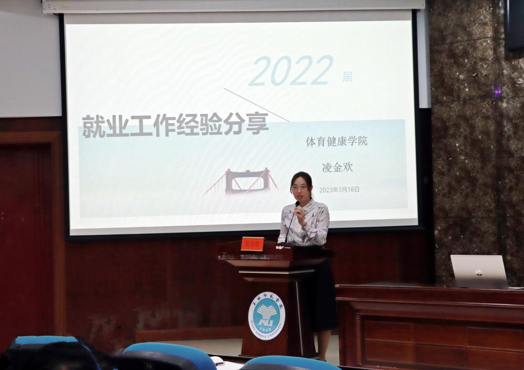 数学与统计学院党委书记庞伟、体育健康学院就业辅导员凌金欢分别代表先进集体和先进个人作经验交流发言。