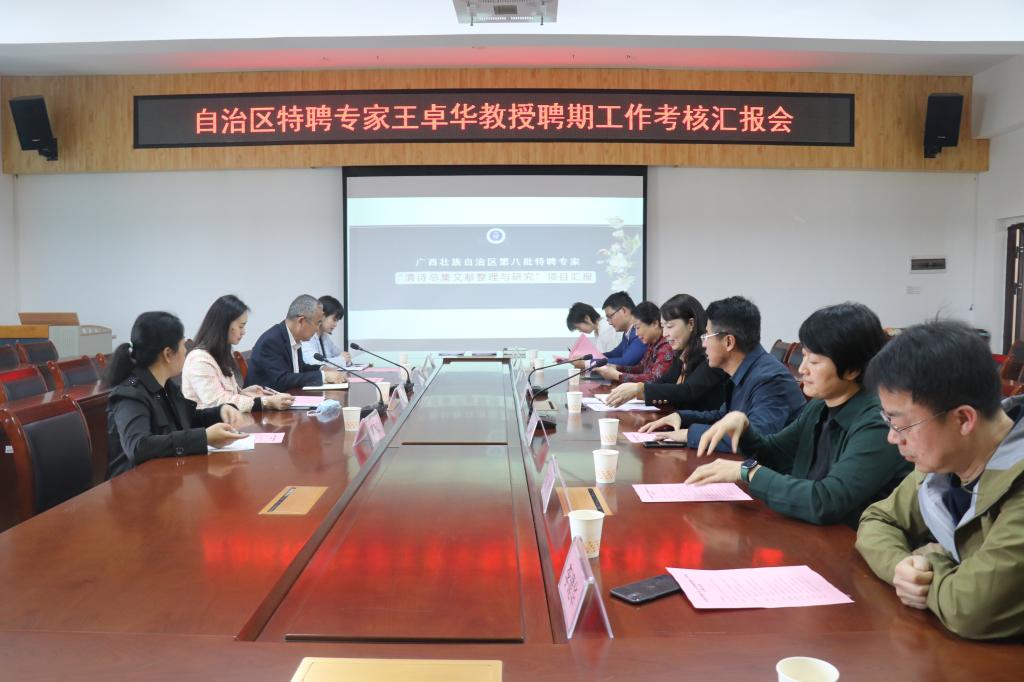 3月16日中午,我校在东校区至善楼309会议室召开自治区特聘专家王卓华教授聘期工作考核汇报会,总结、汇报王卓华教授在我校聘期的工作情况和工作成果,进一步推进我校高层次人才建设工作。考核组由广西壮族自治区人力资源和社会保障厅专业技术人员管理处副处长林臻桢、相关专家覃周敏,玉林市人力资源和社会保障局相关负责人、工作人员组成。我校副校长高红艳及人事处、文学与传媒学院相关负责人参加会议。