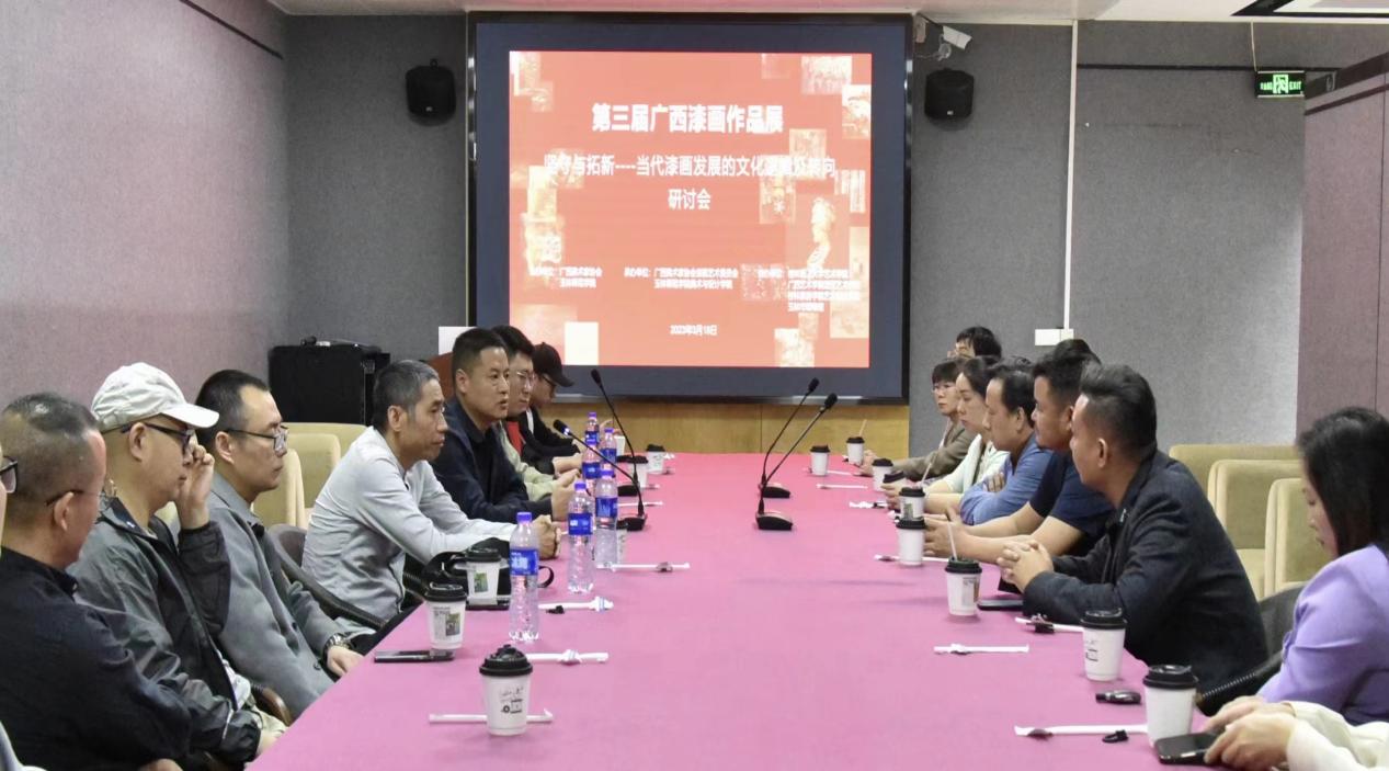 开幕式结束后,与会嘉宾共同参加了“坚守与拓新----当代漆画发展的文化逻辑及转向”学术研讨会,围绕未来广西漆画创作的走向进行了深入的交流研讨。