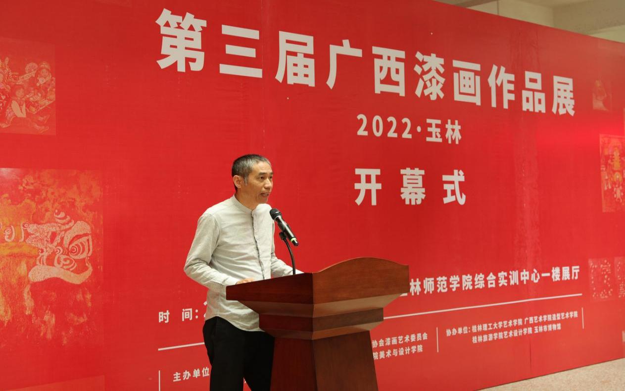 韦广雄在开幕式上致辞。他代表完美(中国)对与会嘉宾的到来表示热烈欢迎和衷心的感谢。他表示,广西美术家协会确定由我校承办第三届广西漆画作品展,是对我校在美术教育和美术创作领域成绩的充分认可,也是对我校漆画创作水平和承办高规格艺术展览能力的肯定。本次展出的100余幅作品展现出了广西漆画的学术性、研究性、表现性、艺术性和文化性在全国的影响力。他希望各位专家以本次展览和主题研讨会为契机,深入学习贯彻党的二十大精神,把握时代发展脉搏,坚持以人民为中心的创作导向,推出更多增强人民精神力量的优秀作品,共同为广西文化艺术事业的新发展添能助力。