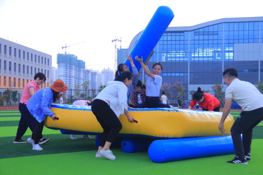 本次素质拓展活动紧扣“学习二十大 奋进新征程 担当新使命”的主题,设置有“同舟共济”“巧赶双球”“万众一心”“斗转星移动”等项目。在素质拓展指导老师的指导下,辅导员队伍分为六个小组,小组成员之间团结协作、齐心协力完成每一个活动项目。随着活动项目的推进,现场气氛逐渐热烈高涨,欢声不断。