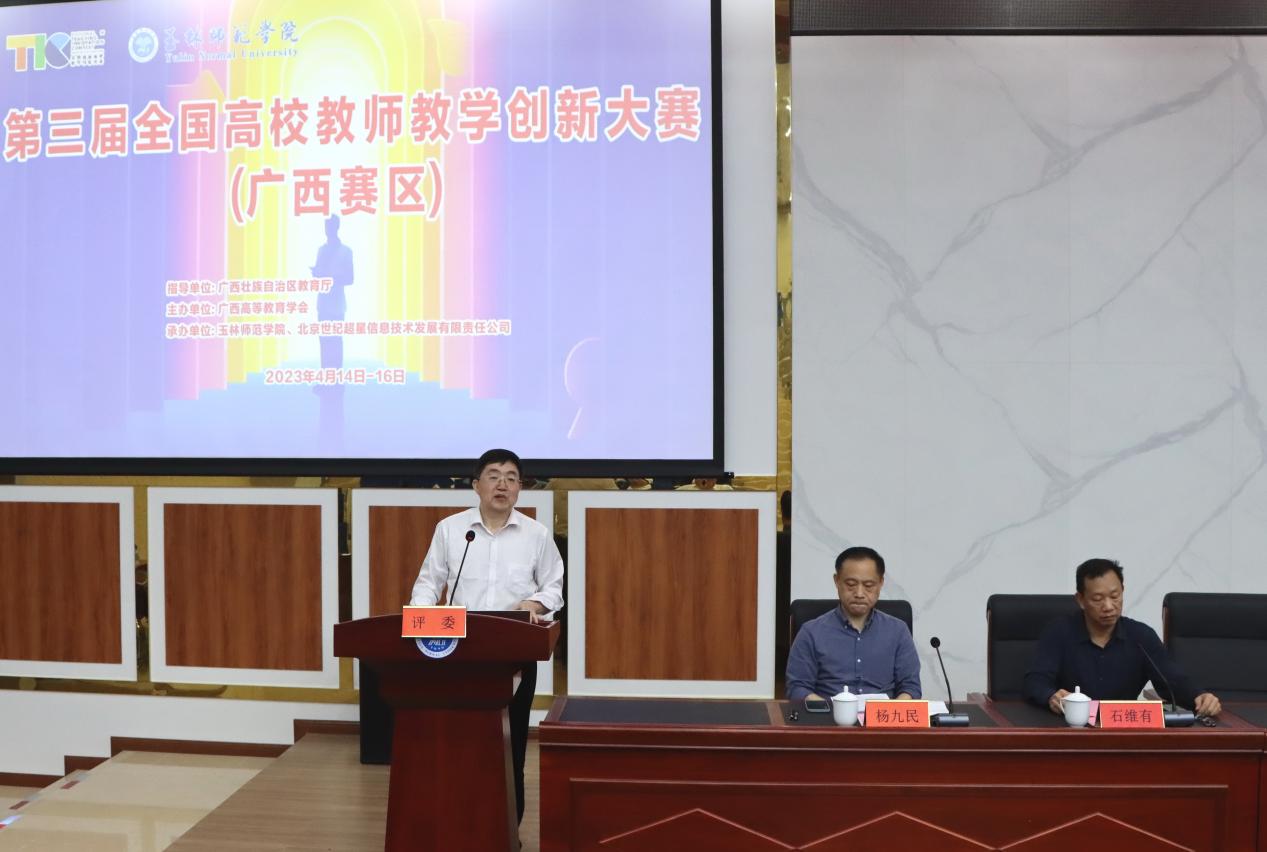 广西高等教育学会副会长王恩界代表主办方作总结发言。他认为,本届大赛是一次难得的教学交流,通过直播的形式为全区乃至全国的教师提供了示范,为广西选出了教师精英参加全国大赛。他同与会人员分享了三点感受:一是“祝贺”,他从全国高校教师教学创新大赛的重要地位出发,向在本届比赛中获得殊荣的选手表示祝贺,向成功举办本次大赛的玉林师范学院表示祝贺;二是“感谢”,他对评委专家在赛前网络评审、现场高强度工作的辛苦付出给予了高度肯定,赞扬了他们为广西选才、为广西育才的强烈责任心,同时,对玉林师范学院保障赛事顺利和参赛选手为本届比赛提供精彩的教学展示表示感谢;三是“祝愿”,他祝愿参加全国大赛的选手获得更好更优异的成绩,并希望他们按照评审专家的意见继续提升自我,为广西争光,为广西高校教师争光。